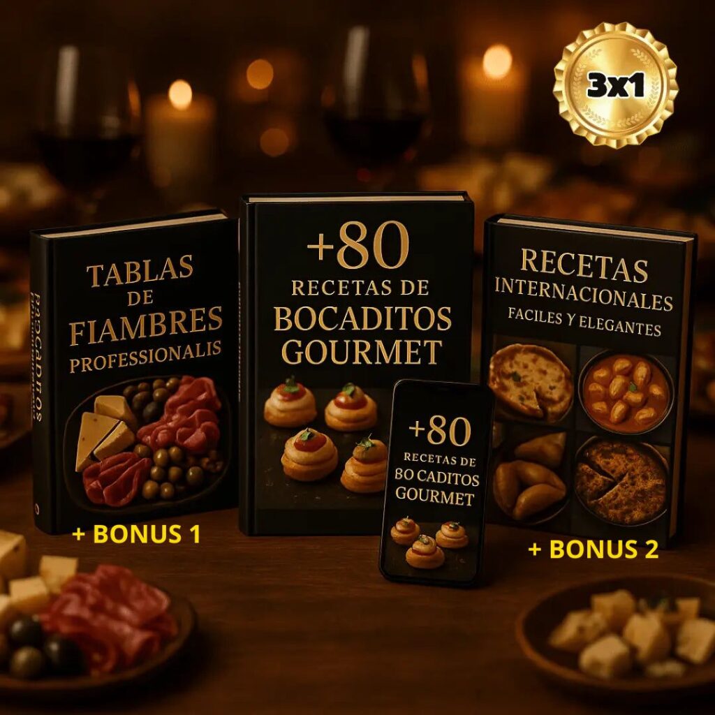 El Combo Gourmet 3×1 es una oferta exclusiva que incluye 1 ebooks digitales y 2 bonus adicionales para ayudarte a mejorar tus habilidades en la cocina y sorprender a tus invitados. Los ebooks son: